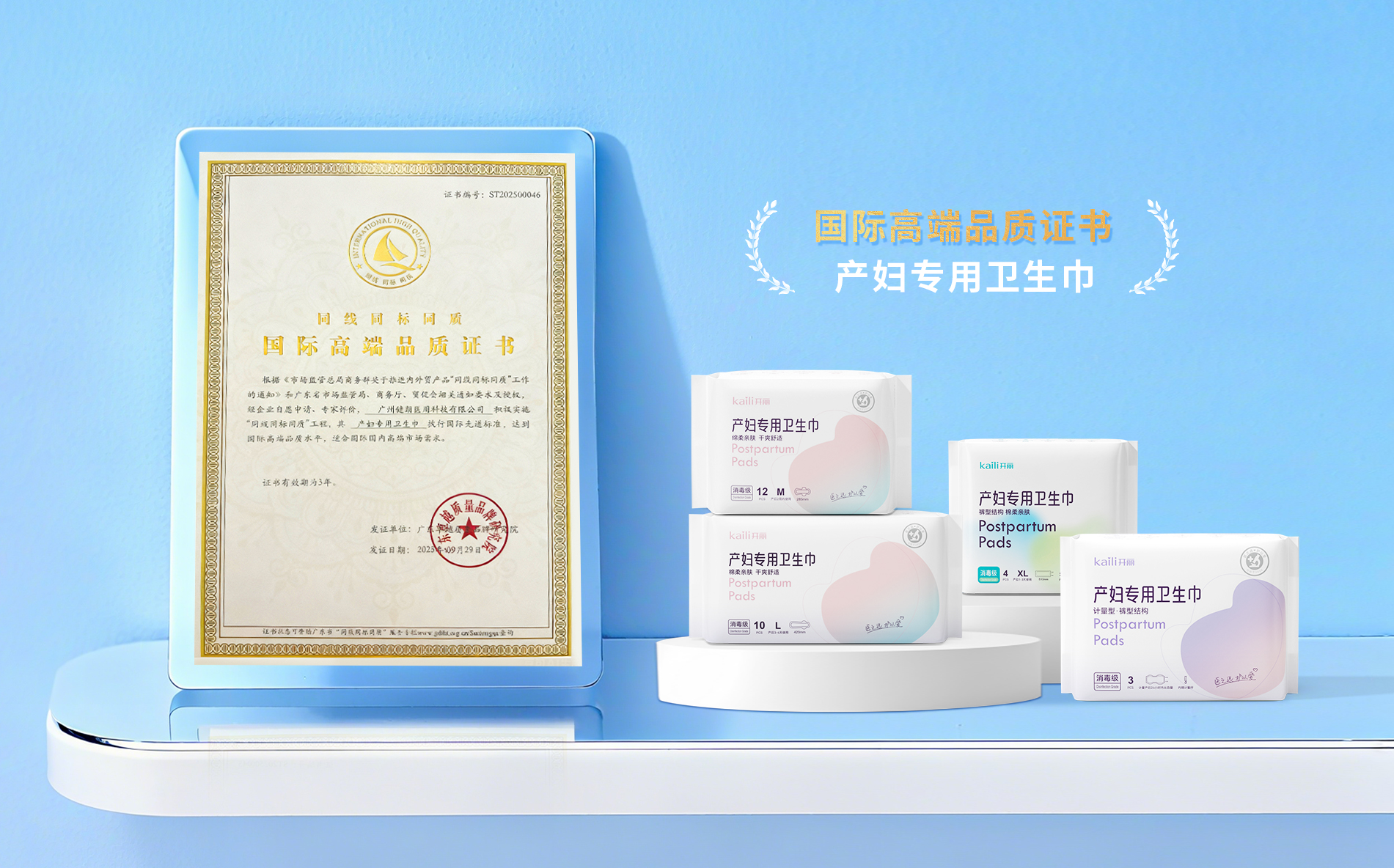 在此次博览会上,备受关注的“三同”(同线同标同质)国际高端品质产品发布环节,广州健朗医用科技有限公司旗下品牌“kaili开丽”的三款核心产品——产妇专用卫生巾、婴儿护脐带、婴儿护脐贴,凭借卓越品质成功入选广东省第二批“三同”产品名单。
